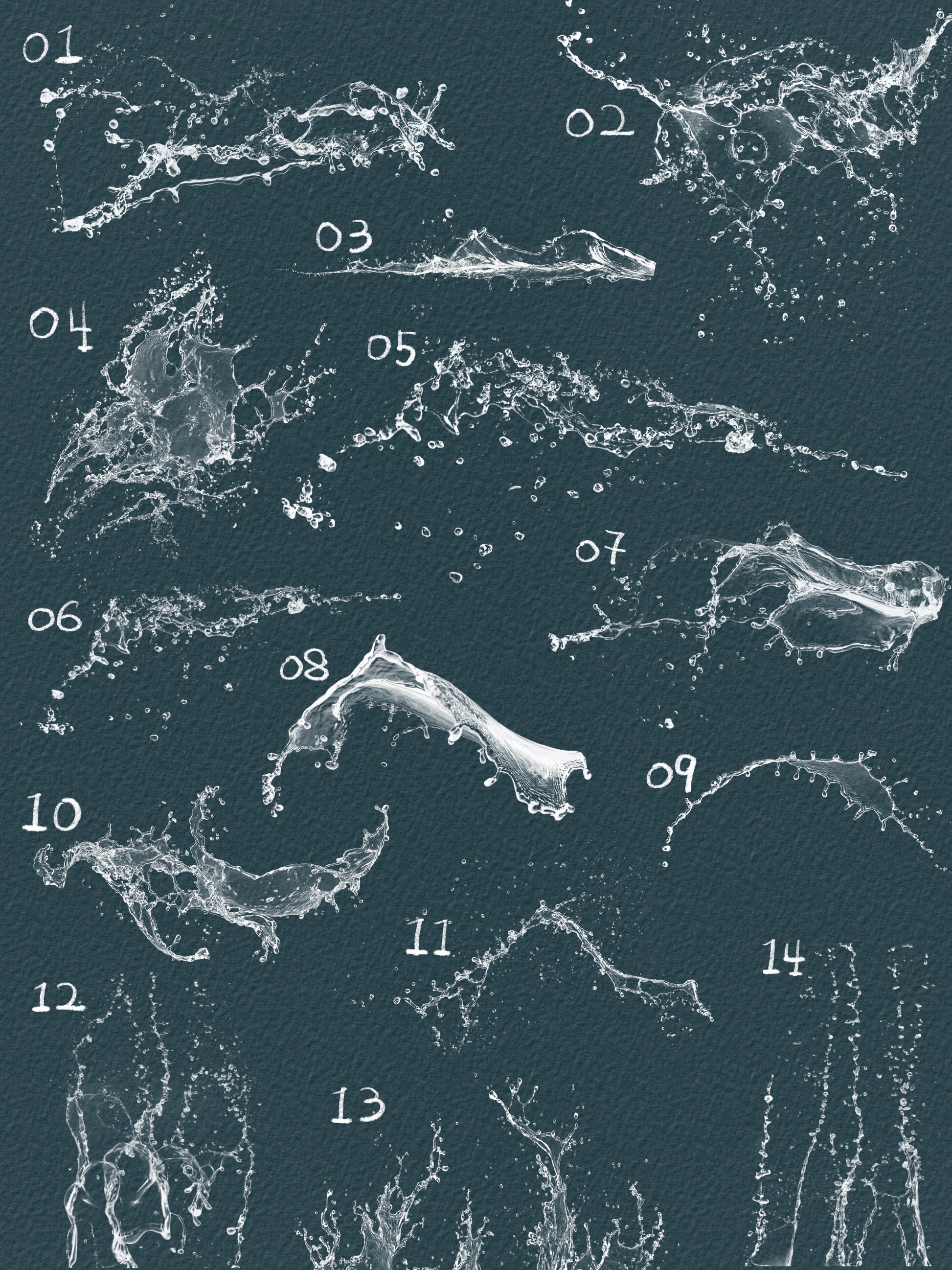 This brush set is made to draw energetic water splashes, drips, and spray — perfect for action scenes, fantasy effects, or dynamic composition accents.