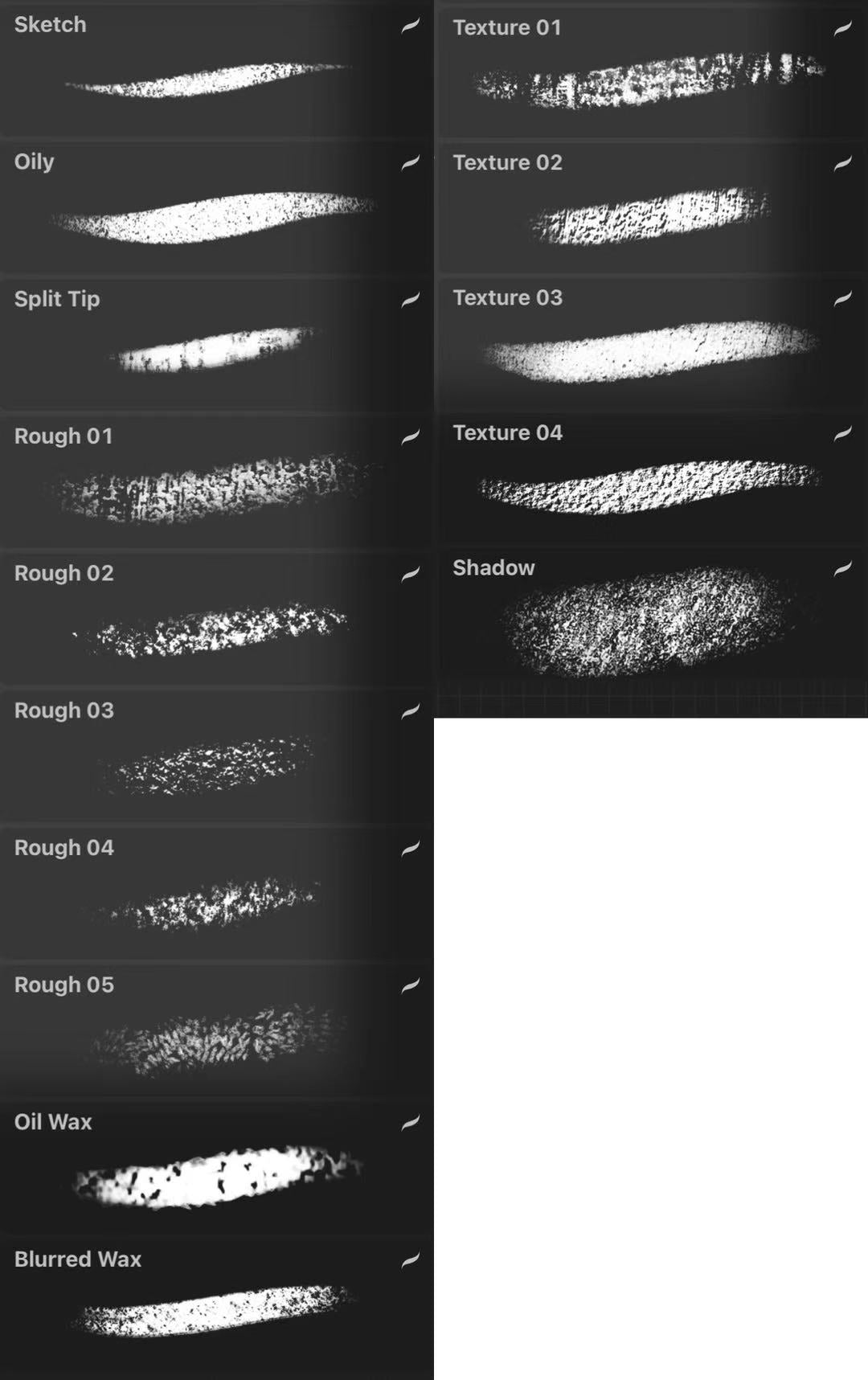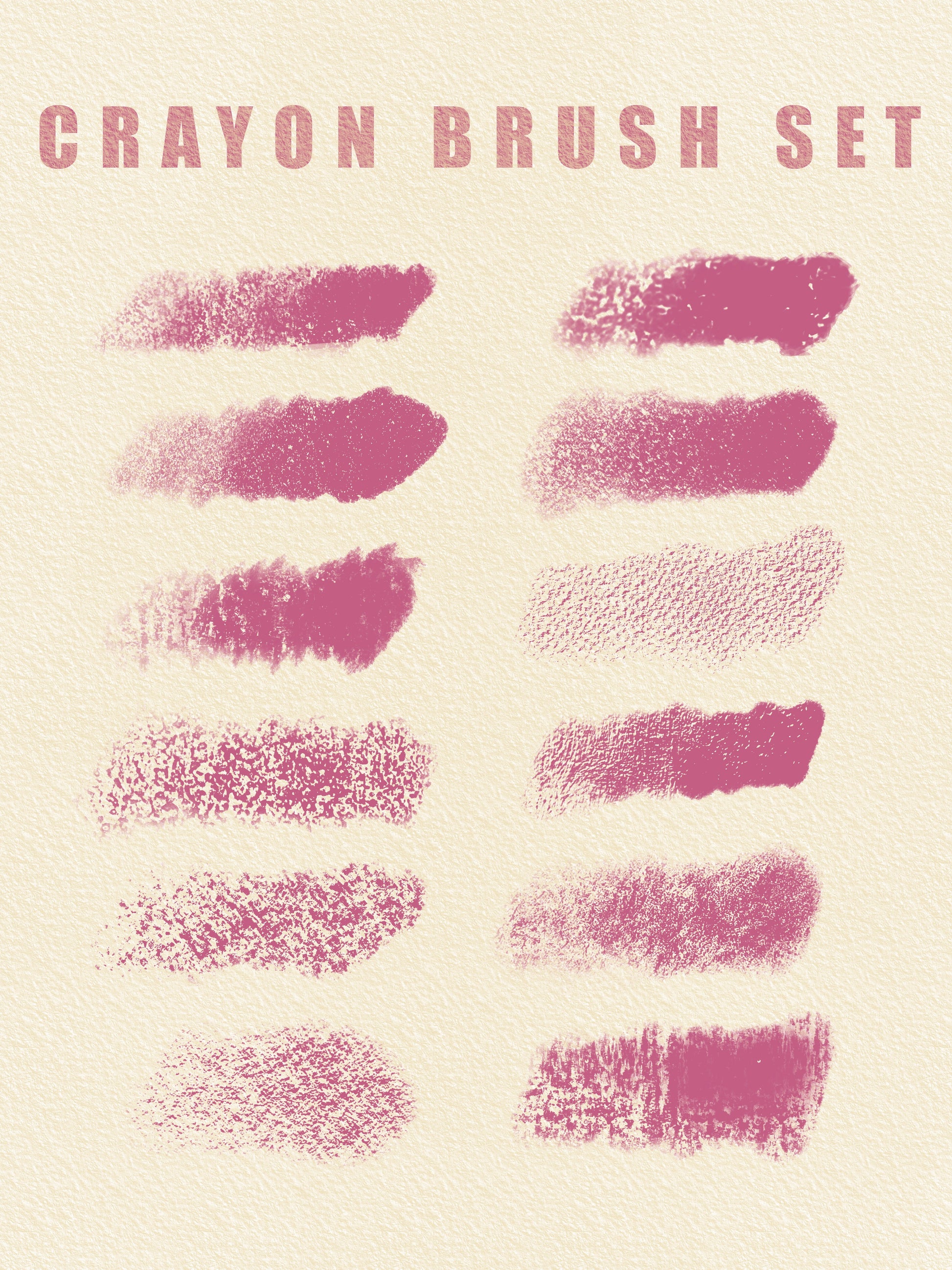 15 textured crayon brushes (grainy, soft, edge-drag, fill)